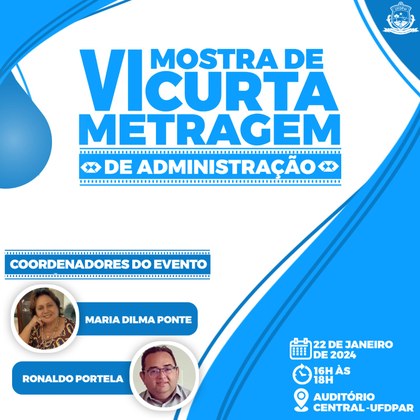 O Curso de Administração da Universidade Federal do Delta do Parna´ba (UFDPar) realiza no dia 22/01/2024, das 16h às 18h, no Auditório Central, a VI Mostra de Cruta Metragem de Administração. O intuito do evento é exibir os trabalhos audiovisuais produzidos pelos estudantes do Bloco II de Administração. O Projeto é coordenado pela Profa. Maria Dilma Ponte de Brito e pelo Prof. Ronaldo Portela de Oliveira, ambos docentes do curso. Para se inscrever acesse aqui.