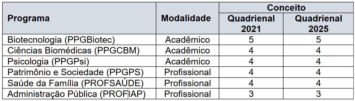 A manutenção dos conceitos evidencia a consolidação da UFDPar no cenário nacional da pós-graduação, especialmente diante de um ciclo avaliativo marcado por severas adversidades. A Avaliação Quadrienal 2021–2024 abrangeu um período fortemente impactado pela pandemia de Covid-19, que impôs efeitos negativos significativos à condução das atividades acadêmicas, à mobilidade científica e à produção intelectual em todo o país. Ainda assim, a manutenção das notas alcançadas pelos programas da UFDPar configura um resultado expressivo, demonstrando a resiliência dos PPGs, o compromisso acadêmico e a capacidade de organização institucional. Esses resultados refletem um processo contínuo de amadurecimento, sustentado por planejamento estratégico, fortalecimento institucional e pela construção de bases sólidas que pavimentam o avanço futuro dos conceitos.