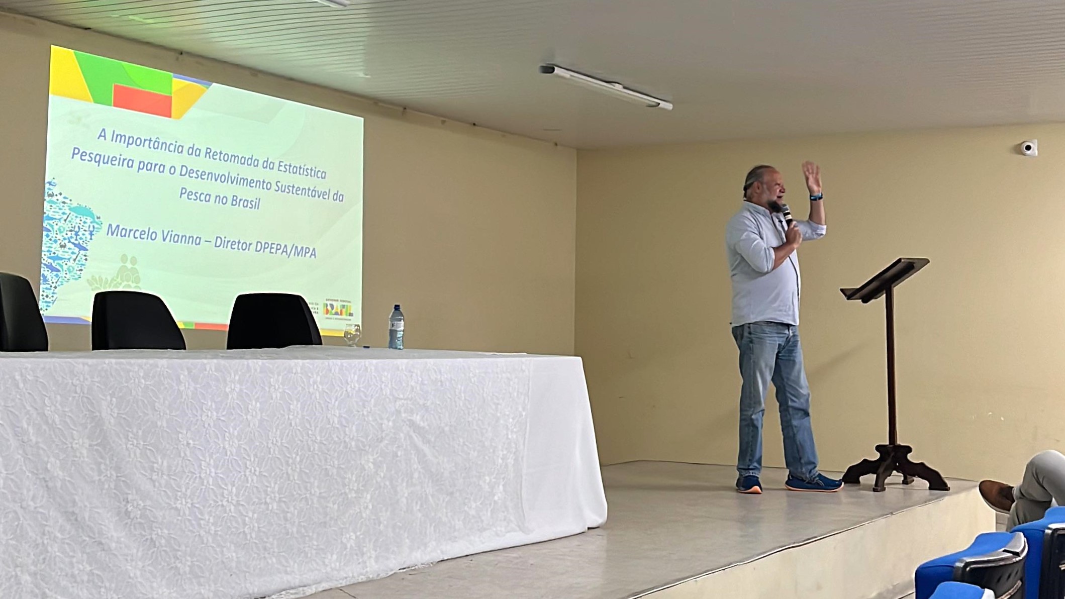 Foto: Diretor do Departamento de Pesquisa e Estatística da Pesca e Aquicultura do Ministério da Pesca e Aquicultura (MPA), Prof. Dr. Marcelo Vianna, palestrante principal do evento.