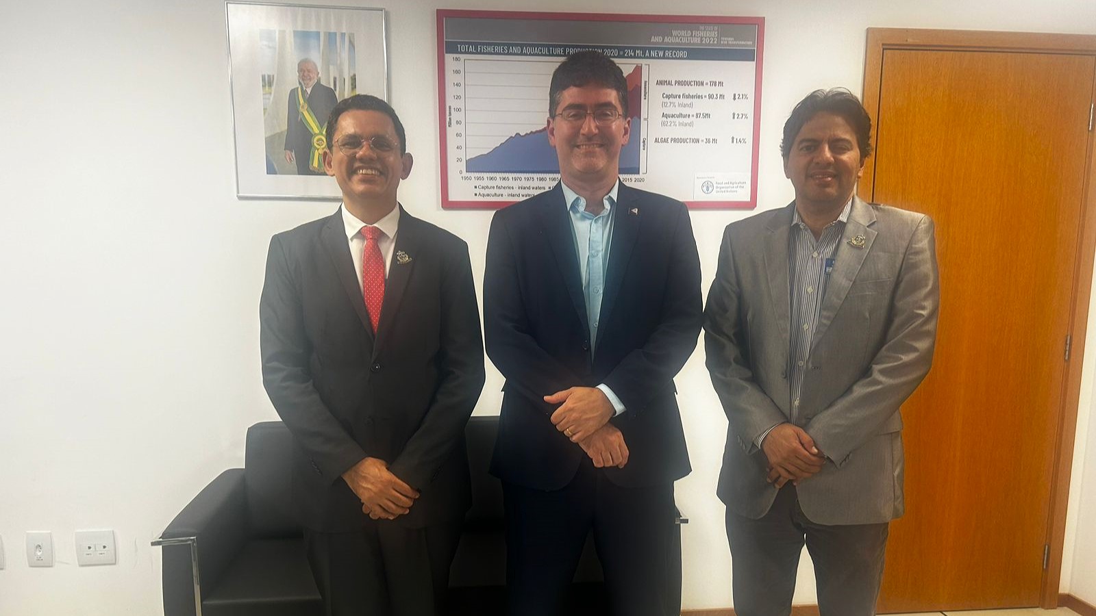 Também foi realizada uma reunião com Paulo Mário de Farias, secretário nacional substituto da Secretaria Nacional de Aquicultura, vinculada ao Ministério da Pesca e Aquicultura. O diálogo teve como foco o fortalecimento do curso de Engenharia de Pesca e da Estação de Aquicultura da UFDPar, a partir do estabelecimento de novas parcerias e ações conjuntas voltadas ao setor.