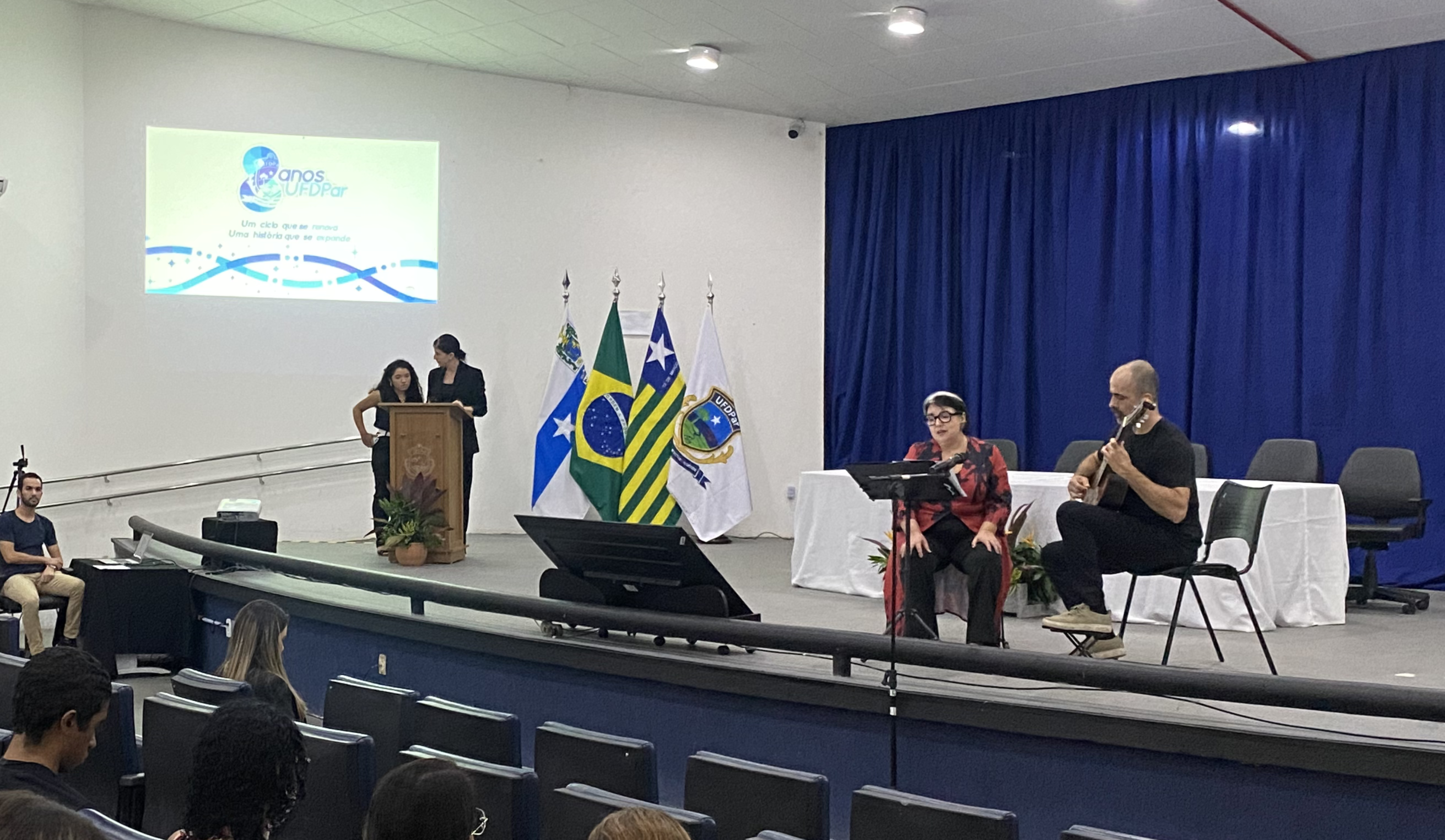 A programação teve início com uma apresentação musical conduzida pela professora Paula Maria Molinari e pelo professor Cristiano Braga de Oliveira, ambos do curso de Música, proporcionando um momento artístico que marcou a abertura da sessão.
