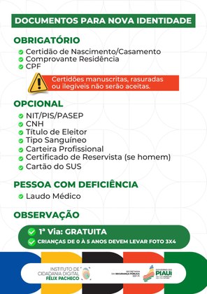 A Universidade Federal do Delta do Parnaíba (UFDPar) promoverá, nos dias 07 e 08 de abril, uma ação de cidadania voltada à emissão da nova Carteira de Identidade. O atendimento ocorrerá no horário de 08h às 13h, na sala de reuniões do curso de Pedagogia, localizada no Bloco 16 das coordenações, sala 110.