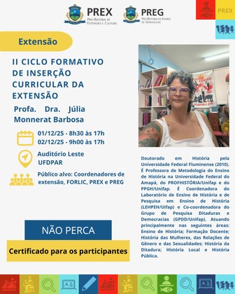 A programação contará com a presença da professora doutora Júlia Monnerat Barbosa, da Universidade Federal do Amapá (UNIFAP), referência nacional na temática da curricularização da extensão universitária. O encontro será realizado no Auditório Leste da UFDPAR e concederá certificação aos participantes.