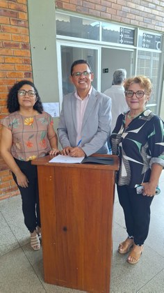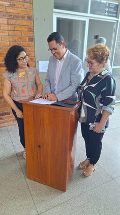 Reitor ladeado pela Pró-reitora de Assuntos Estudantis e pela Pró-reitora de Ensino de Graduação no ato da assinatura